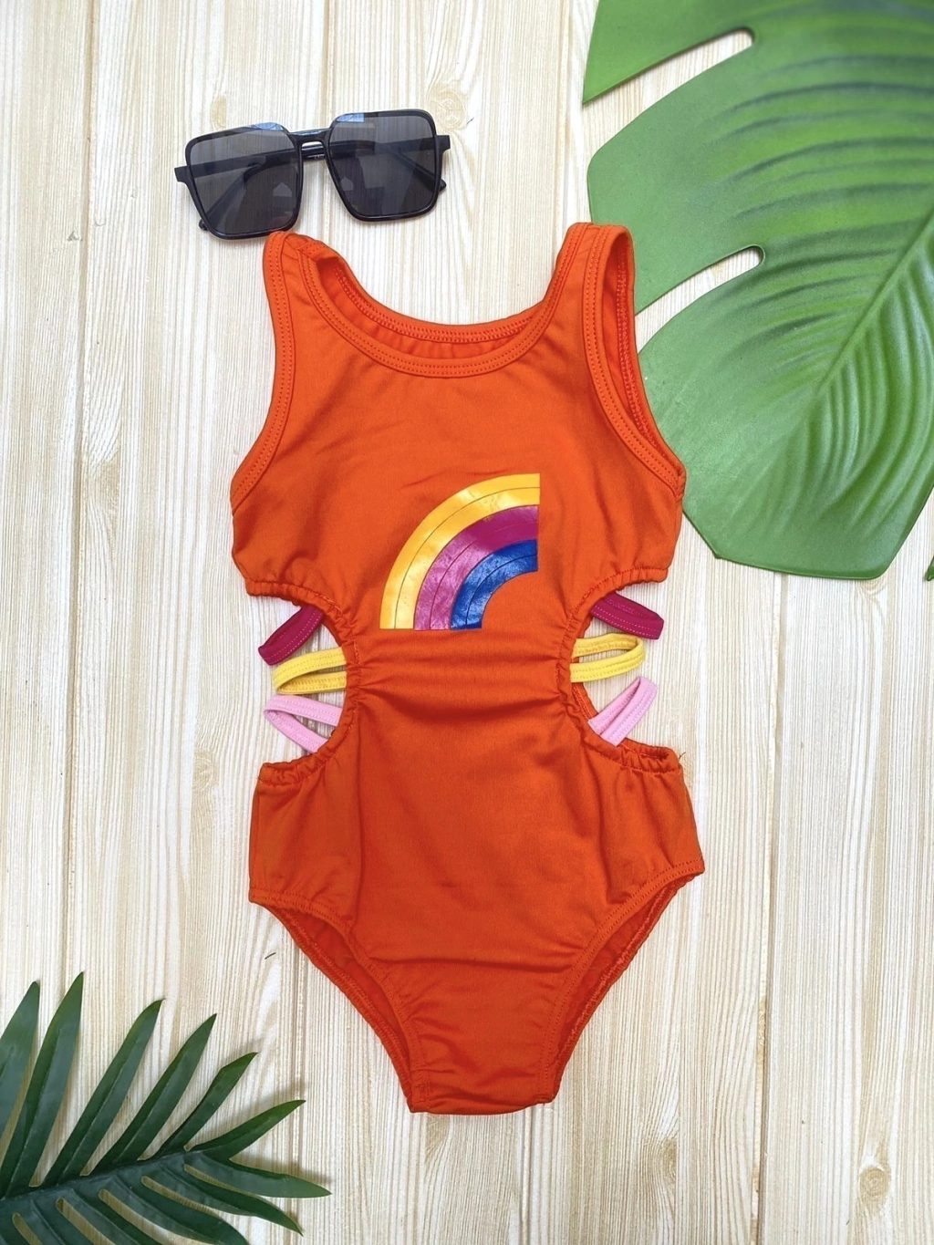 Body Maiô em tecido suplex com tiras na lateral e estampa de arco iris, disponível em duas cores